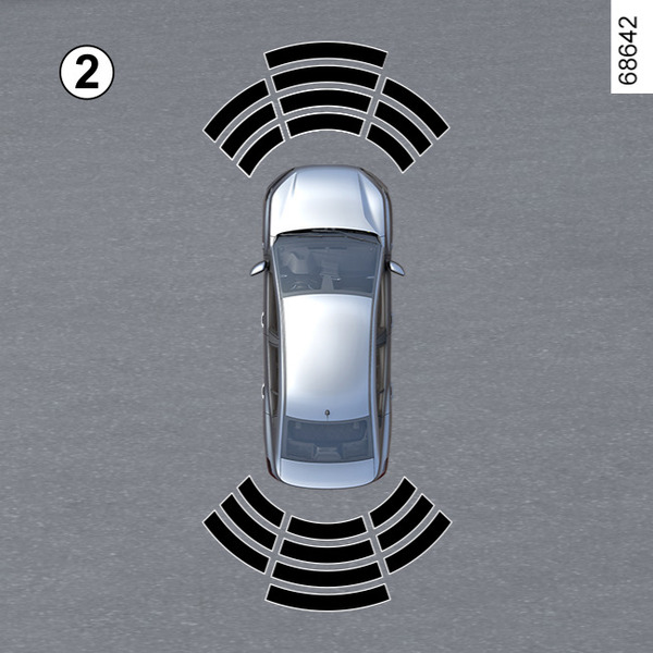 تأكد من أن المنطقة المحيطة بأجهزة الاستشعار بالموجات فوق الصوتية المشار إليها بالأسهم 1 لا يتم حجبها (بفعل الأوساخ، الطين، الثلوج، لوحة أرقام تم تركيبها/تثبيتها بشكل سيئ، وما إلى ذلك)، أو التأثير عليها، أو تعديلها (بما في ذلك الطلاء)، أو إعاقتها من قِبَل أي ملحق يتم تركيبه على الجزء الخلفي و/أو، حسب طراز السيارة، الجزء الأمامي من السيارة.