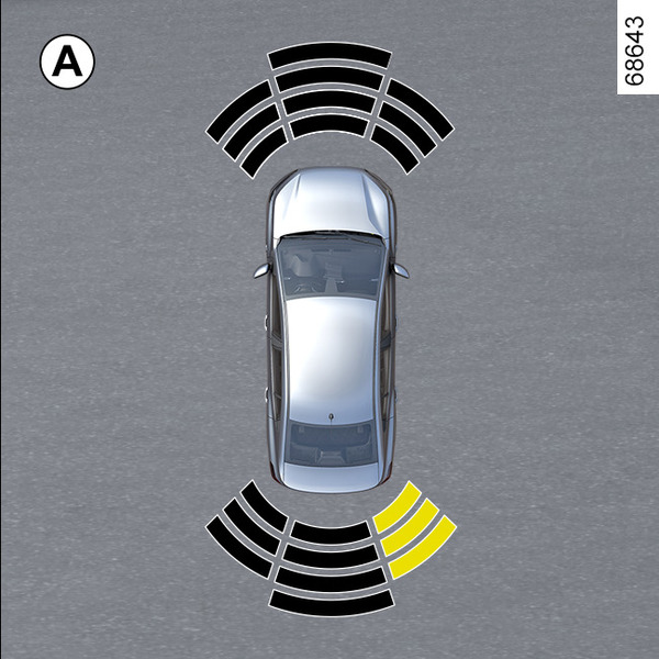 حسب طراز السيارة، يتم عرض المنطقة التي تم اكتشاف العائق فيها (الشاشة A). حسب طراز السيارة، يتم عرض المنطقة باللون الأخضر أو البرتقالي (أو الأصفر حسب طراز السيارة) أو الأحمر، حسب مدى قرب العائق المكتشف.
