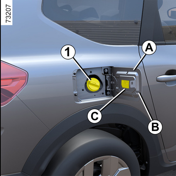 لإغلاقه، اضغط على غطاء خزان الوقود A بيديك، إلى أقصى قدر يمكن أن تصل إليه. في بعض أنواع السيارات، يمكن فتح السدادة 1 باستخدام مفتاح الإشعال. وإلا يتم توصيله بالسيارة باستخدام شريط من البلاستيك. للحصول على تفاصيل حول ملء خزان الوقود، يُرجى الرجوع إلى المعلومات المتوفرة حول "ملء الوقود".