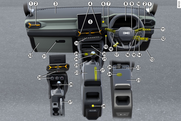 مقصورة القيادة ذات المقود جهة اليمين <?xml version="1.0" standalone="yes"?> وجود هذه التجهيزات يعتمد على طراز السيارة والبلد.1. فتحة إزالة بخار الماء.2. فتحات التهوية الجانبية. الفصل