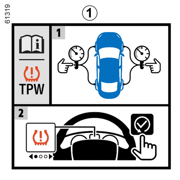 2 | Er dæktryk ok Hold | Meddelelsen blinker. Dette er en påmindelse om, at trykket skal justeres til de referenceværdier, der anbefales på dæktryksmærket Dæktryk. Tryk på kontakten 5OK, og hold den nede for at bekræfte nulstillingsanmodningen, indtil meddelelsen "operation fuldført" vises. |