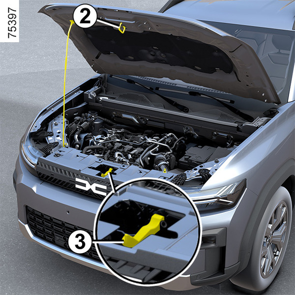 To unlock, release the hook 2 by pushing the lever 3 towards the left while raising the bonnet.