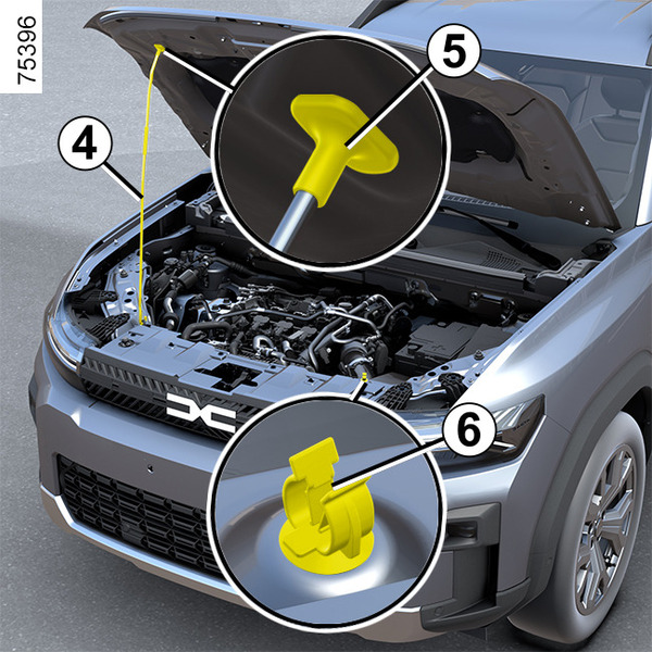 After raising the bonnet and releasing the strut 4 from its holder 6, for your safety, you must engage the strut into its mounting 5.