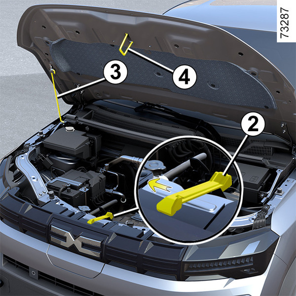 Lift the bonnet ; remove the Stay rod 3 from lock clip and place into the hole to hold the bonnet open.