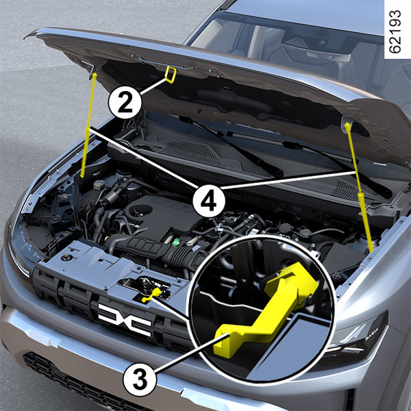 Raise the bonnet slightly and release the hook 2 by pushing tab 3 to the left.