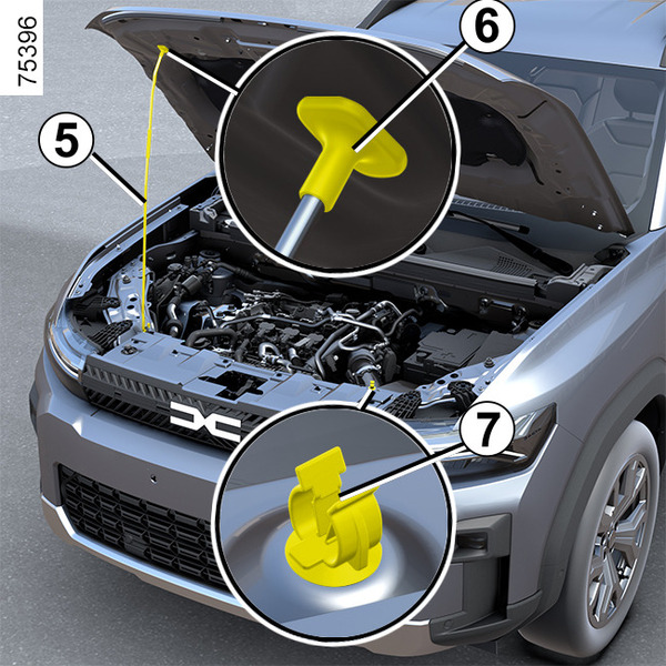After raising the bonnet and releasing the strut 5 from its holder 7, for your safety, you must engage the strut into its mounting 6.