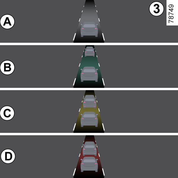 • B (green): the time interval is greater than or equal to around two seconds (distance between the two vehicles adapted to your speed);