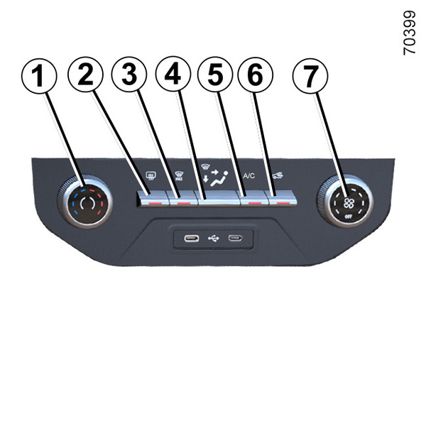 The air conditioning is switched on (indicator light illuminated) or off (indicator light extinguished) using button 5.