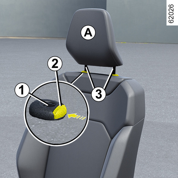 Insert the headrest rods into the holes 1 (tilt the seatback backwards if necessary). Lower the headrest until it locks and press button 2 to adjust to the desired height. Check that each rod 3 is locked on the seatback.