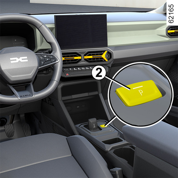 With the vehicle stationary and the engine running or the ignition on, press the button 2 to engage P position. The warning light on button 2 appears in orange once the Park P position is engaged on the gearbox.