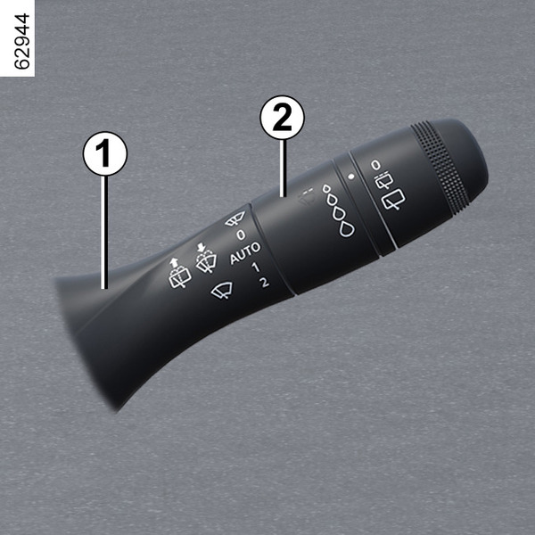 Note: when washing the vehicle using a carwash, return the ring 2 on the stalk 1 to the off position in order to deactivate wiping.