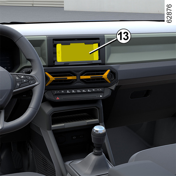 For vehicles equipped with it, open the bottom hatch 10: lift the hatch 9, place your phone 13 in the horizontal position in the slider 12 and then lower the hatch 9 while positioning the phone in the slide 11.