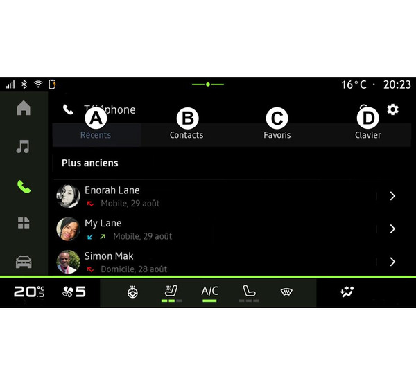 , press the "Favourites" tab C to access the contacts saved in your smartphone favourites or add them manually from the "Contacts" list on the multimedia system.