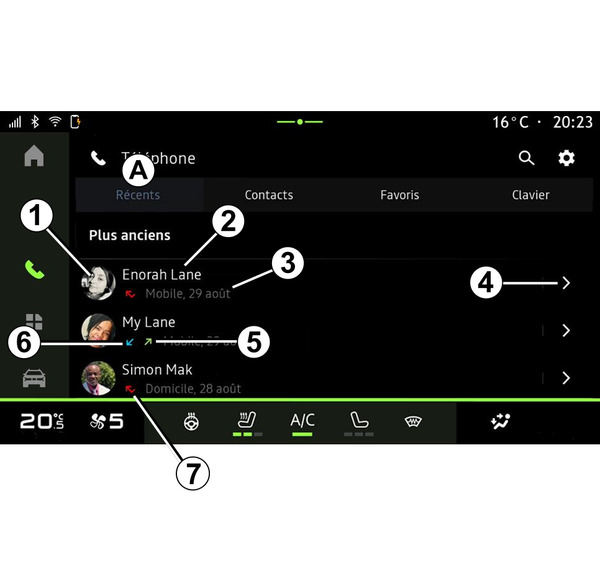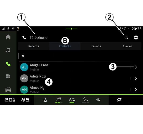 , press the "Contacts" tab B to access your smartphone's phonebook via your multimedia system.