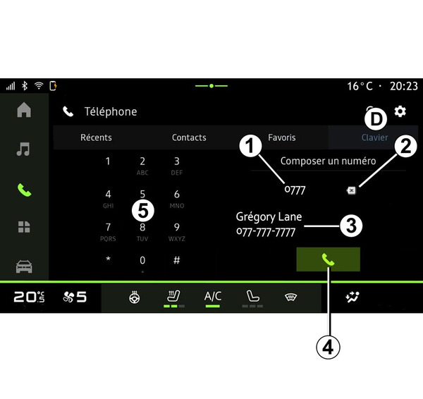 From the "Keyboard" tab D, dial the number using the keypad 5 then press button 4 to start the call.