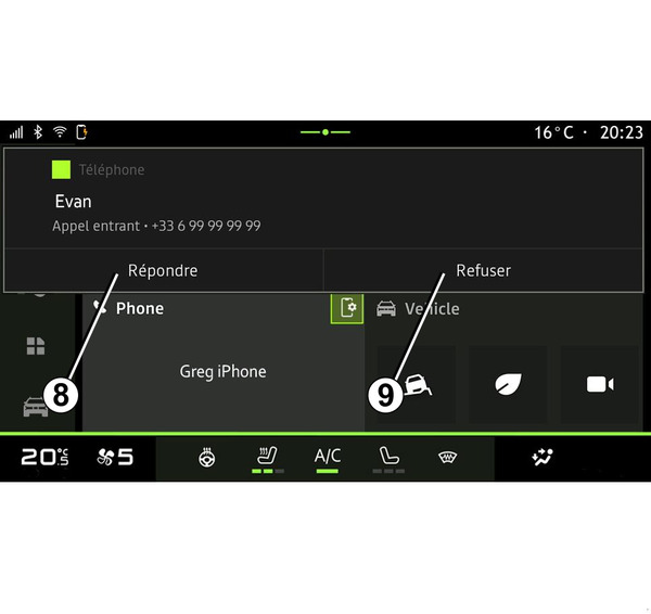 To reject an incoming call, press twice on the steering wheel control 10 or press the "Reject" button 9 on the multimedia system screen.