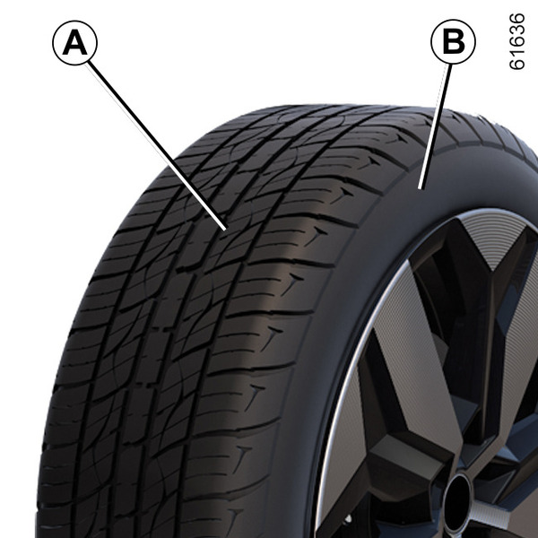 The kit repairs tyres when tread A has been damaged by objects smaller than 4 mm. It cannot repair all types of puncture, such as cuts larger than 4 mm, or cuts in tyre sidewall B.