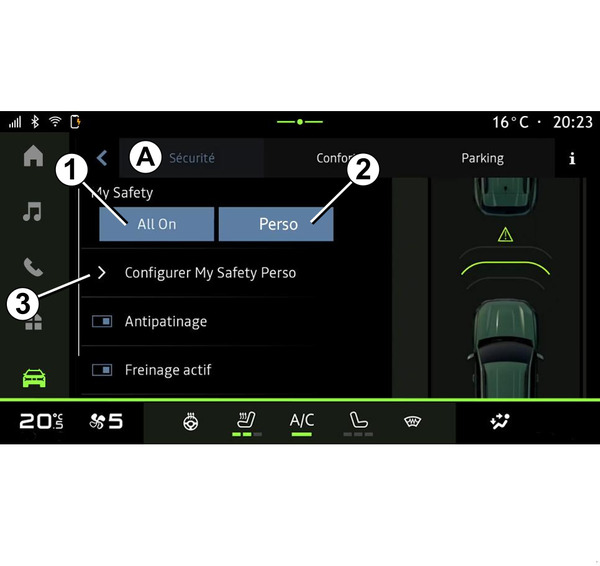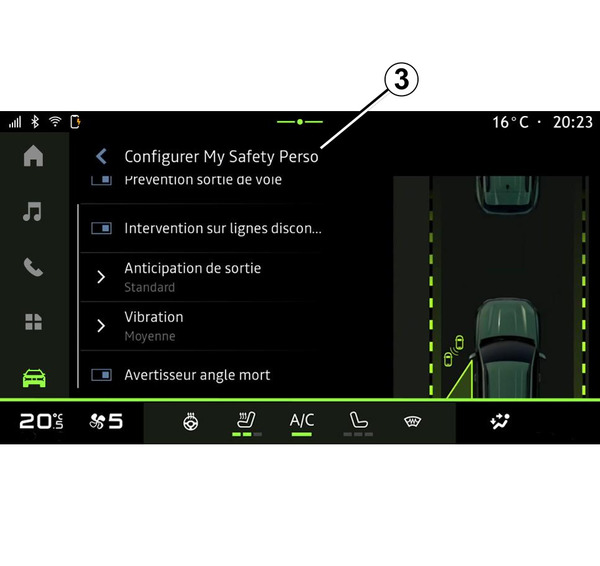 When the My Safety "Perso" function is activated, the safety aids that you have configured and customised using "Configure My Safety Perso" 3 are enabled.