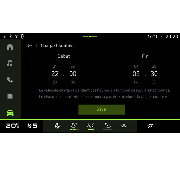 From "Charge settings" 2, adjust the charging start and end time, then press "Save" to confirm.