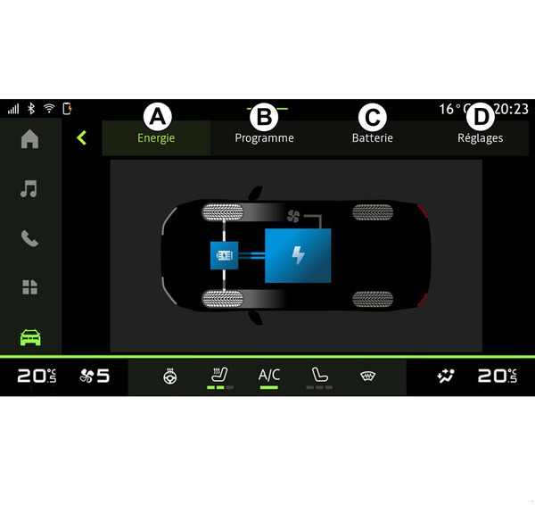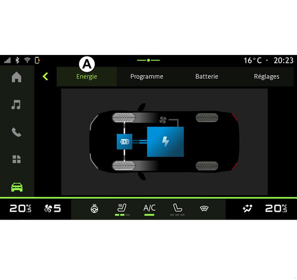 From the "Energy" tab A, the multimedia system enables you to view the vehicle's energy flows.