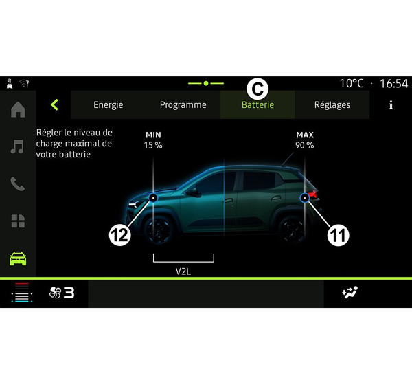 - the minimum level of your vehicle's battery that must not be exceeded when using the "V2L" function, by moving the button 12. Please refer to the vehicle user manual for further information.