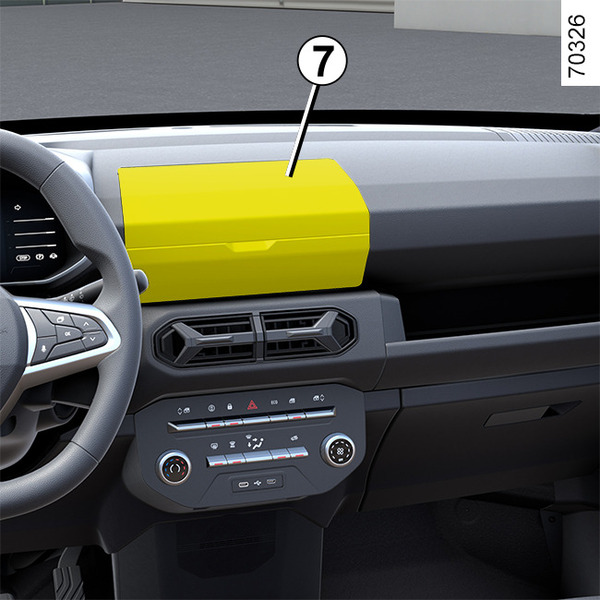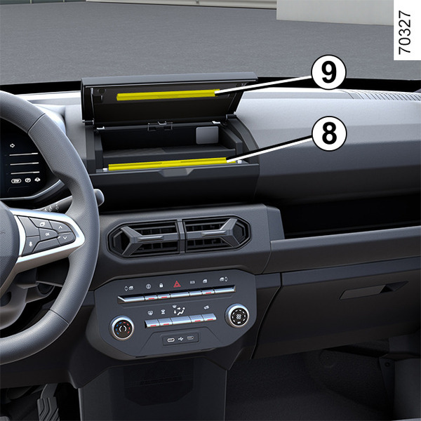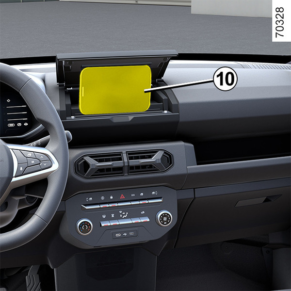 On vehicles that are equipped, lift the flap 7 , place your phone 10 horizontally onto the stand 8 then lower the flap 7 while keeping the phone in position on the stand 9.