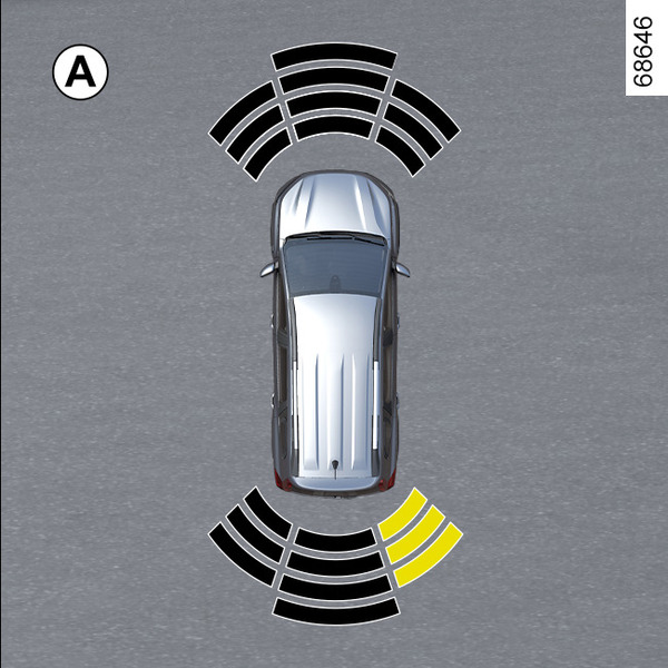 En función del vehículo, aparece el área donde se detecta el obstáculo (pantalla A). Según el vehículo, el área aparece en verde, naranja (o amarillo, dependiendo del modelo) o rojo, en función de la proximidad del objeto.