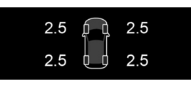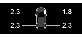 | La rueda y el valor de asociado de la presión se muestran en amarillo. Esto indica que se ha detectado el sub-inflado de algún neumático. Verifique y ajuste la presión de los cuatro neumáticos y, a continuación, reinicialice el sistema. |