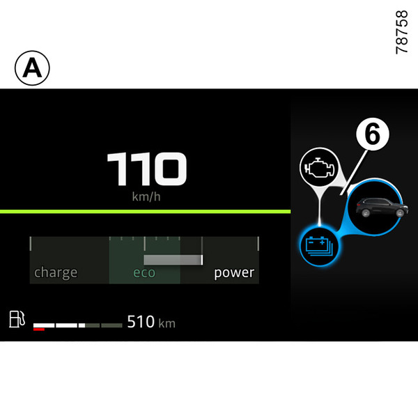 Según el modo de conducción seleccionado, el testigo 6 representa el flujo de energía entre: