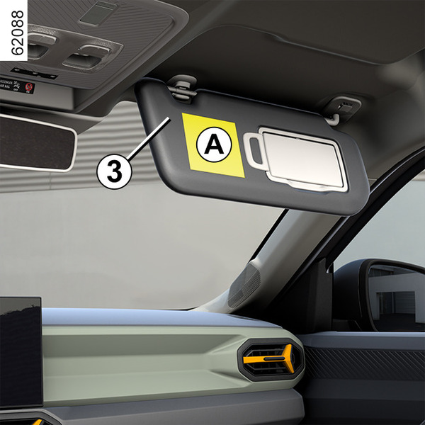 Las indicaciones en el salpicadero y las etiquetas A situadas a cada lado del parasol del pasajero delantero 3 (véase el ejemplo de las etiquetas anterior) sirven para recordar las instrucciones.