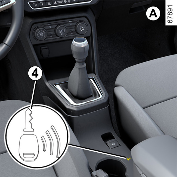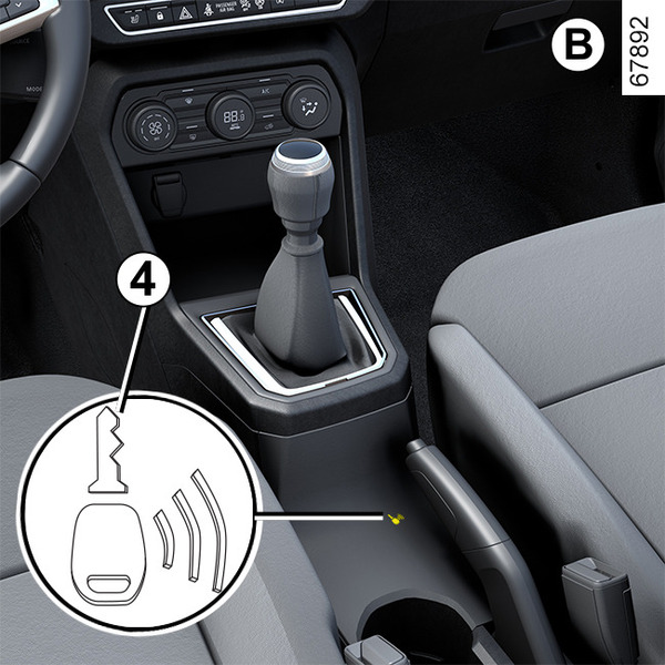Pise el pedal de freno o del embrague y, a continuación, coloque la tarjeta 3 (A o B) en el símbolo 4 (A o B). Presionar el botón 2 para arrancar el vehículo. El mensaje se apaga.