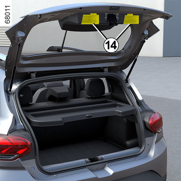 Baje la puerta del maletero ayudándose, en primer lugar, de la empuñadura interior 14, cuando el vehículo disponga de ella.