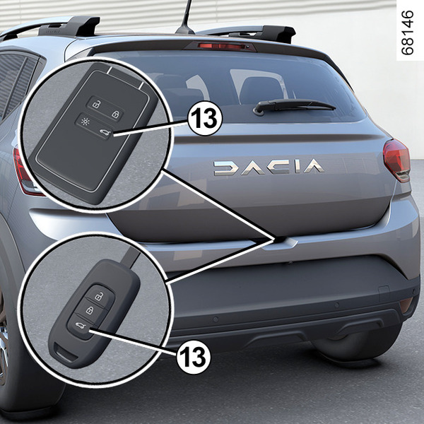 Con las puertas desbloqueadas, presione el botón 12 o, según el vehículo, presione el botón 13 (en la llave o la tarjeta) y la puerta del maletero se abrirá automáticamente.