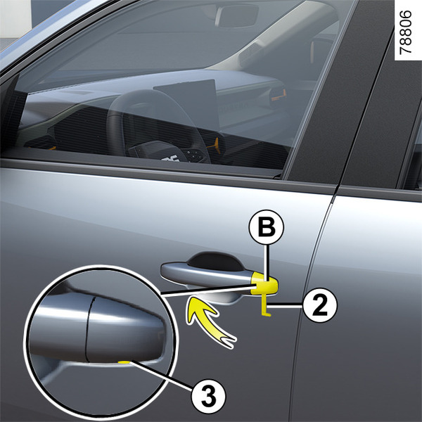 - Inserte el extremo de la llave 2 en la ranura 3 debajo de la tapa B de la puerta del conductor;