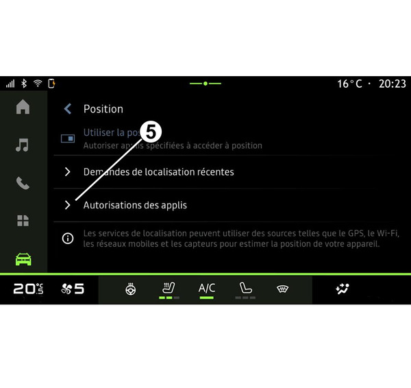 Depuis le menu « Paramètres », « Position », puis « Autorisations des applis » 5 vous pouvez paramétrer l’autorisation de localisation des applications installées sur votre système multimédia.