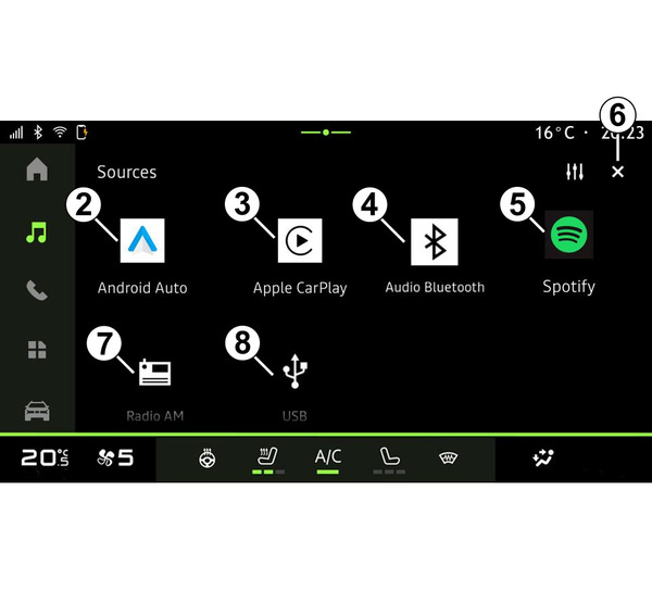 Cette source vous permet d’écouter la musique de votre smartphone via la connexion Bluetooth®. Pour plus d’informations, reportez-vous au chapitre « Musique » Musique et « Connecter, déconnecter un téléphone » Connecter, déconnecter un téléphone.