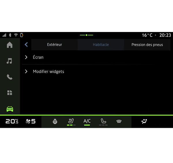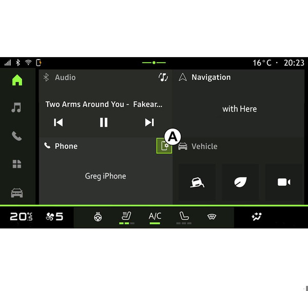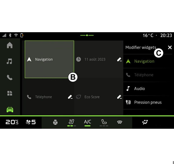 המערכת כוללת 'דף בית' שניתן להתאמה אישית. דף הבית כולל מספר רכיבים גרפיים באזור A, המאפשרים גישה למידע ולפונקציות שונות, כגון My driving, רדיו, לחץ אוויר בצמיגים וכו'.