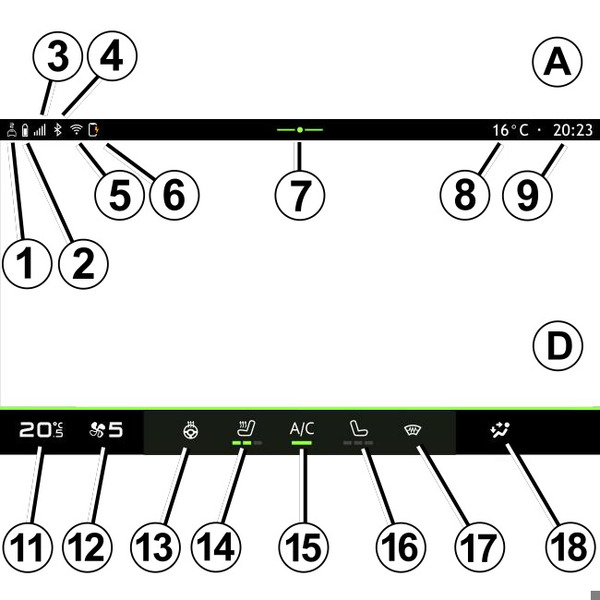 מרכז ההודעות E, שניתן לגשת אליו באמצעות הלחצן 7, או על ידי החלקה מהירה על מסך המולטימדיה מאזור A לעבר מרכז המסך, מאפשר לך לגשת להתראות, "פרופיל" ולפונקציות מסוימות. כדי לצאת ממרכז ההודעות, יש ללחוץ על 7 או להחליק במהירות כלפי מעלה מהתחתית לכיוון מרכז המסך.