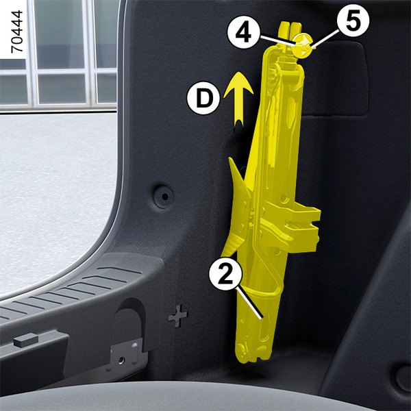 Az emelő használatához le kell tekernie az 4 anyát a 5 rúd végéig, és el kell fordítania felfelé (D mozdulat). A visszatételkor hajtsa össze megfelelően az emelőt, mielőtt a helyére tenné (ne felejtse el visszatenni a kerékanyakulcsot).