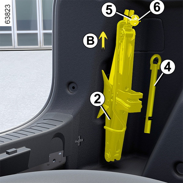 Per utilizzare il cric, svitare il dado 5 fino all'estremità dell'asta 6 e ruotarlo verso l'alto (movimento B). Prima di riporre il cric in sede, ripiegarlo correttamente (assicurarsi di riposizionare la chiave della ruota).