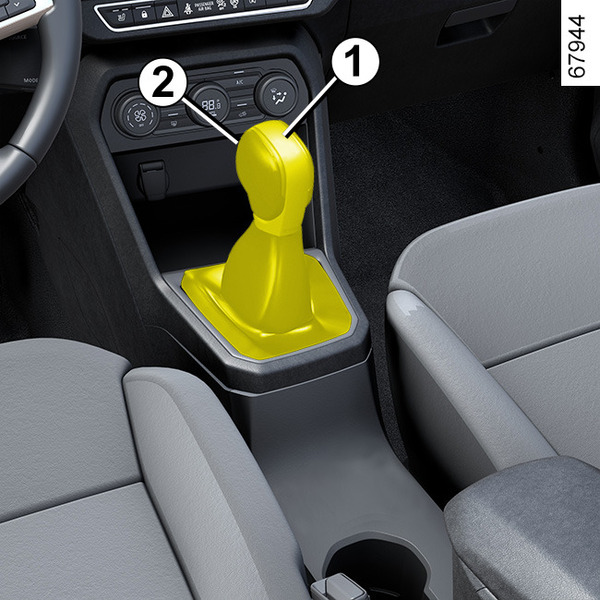 Lai pārslēgtu no pozīcijas P, vispirms obligāti jānospiež bremzes pedālis un tikai pēc tam – atslēgšanas poga 2.