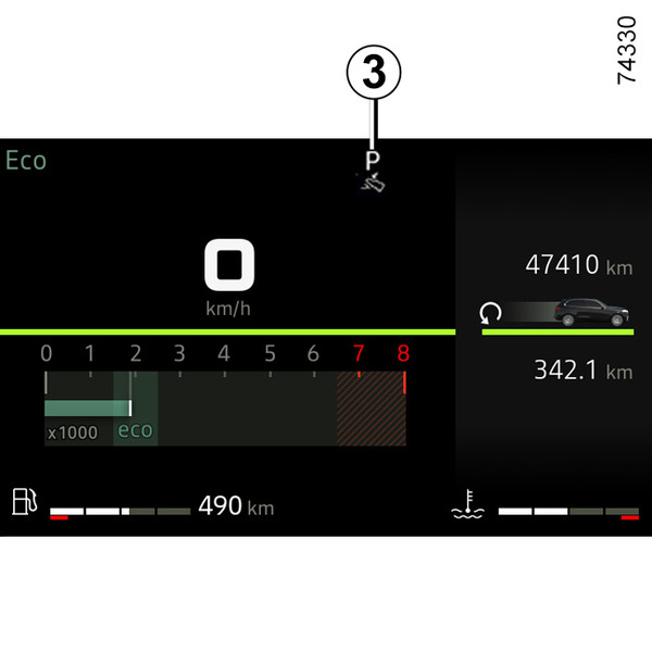 Attēlojums 3 vadības panelī norāda, kāds ir pašreiz izvēlētais pārnesumkārbas pārnesums 1.