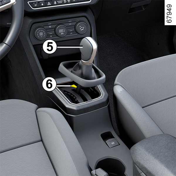Ja, uzsākot kustību, svira bloķējas pozīcijā P, lai gan ir nospiests bremžu pedālis (piemēram, akumulators nedarbojas), ir iespējams manuāli atbrīvot pārslēga sviru, lai atbloķētu velkošos riteņus. Lai to izdarītu, atvienojiet sviras pamatni un nospiediet pogu 6, vienlaikus spiežot pogu 5, lai atbloķētu sviru un pārslēgtos uz stāvokli N.