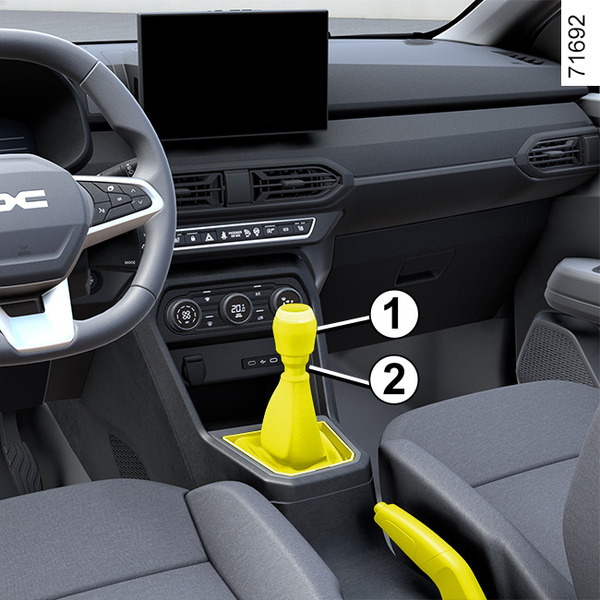Lai pārnesumu pārslēga sviru ieliktu atpakaļgaitas pārnesumā, skatiet sviras roktura shēmu 1 un paceliet roktura gredzenu 2.