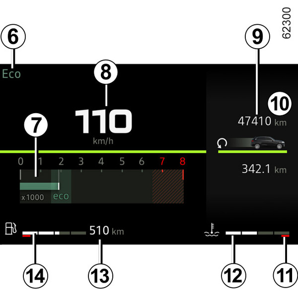 Den klassiske visningen viser viktig informasjon, turtelleren og strømmåleren (avhengig av kjøretøyet) på instrumentpanelet.