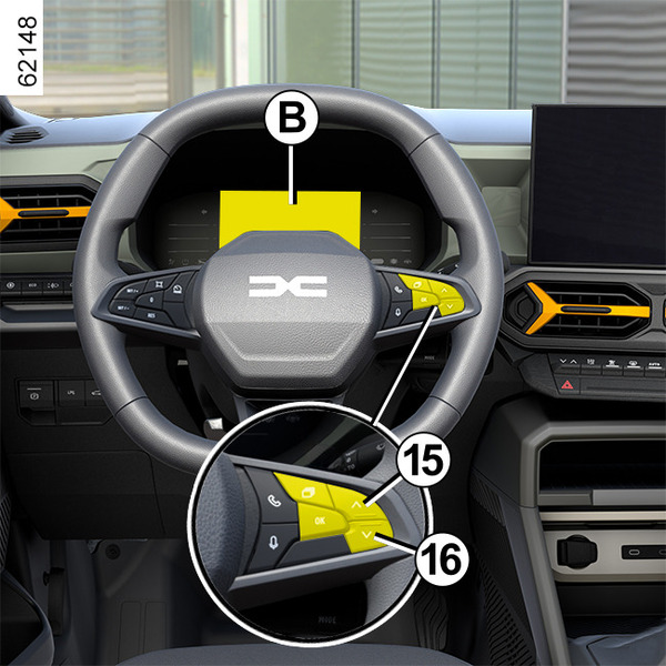 Avhengig av kjøretøyet bruker du kontrollen 15 eller 16 til å velge ulike tilleggsprogrammer på instrumentpanelet: