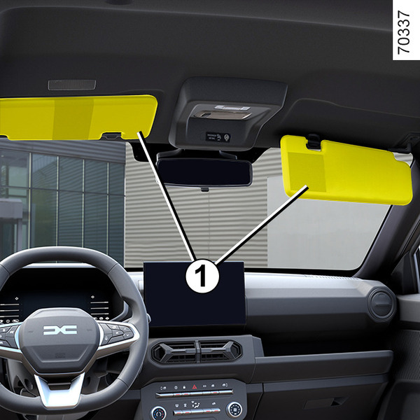 Senk solskjermen 1 ned mot frontruten eller løsne den og vri den over sidevinduet.