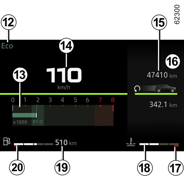 De "Klassieke" weergave toont de essentiële informatie, de toerenteller en de energiemeter (afhankelijk van de auto), op het instrumentenpaneel.