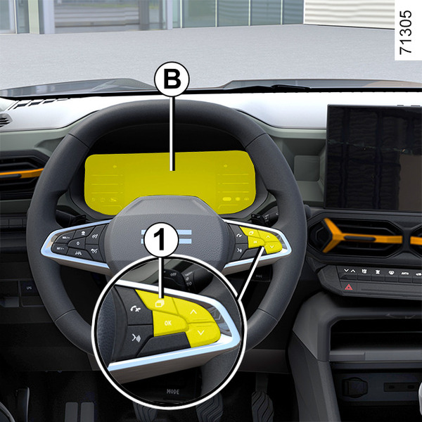Afhankelijk van de auto zijn er verschillende weergaven beschikbaar op het instrumentenpaneel. Om een weergave te selecteren, drukt u zo vaak als nodig is op knop 1 om door de verschillende weergaven op het instrumentenpaneel B te bladeren totdat u de gewenste weergave bereikt.
