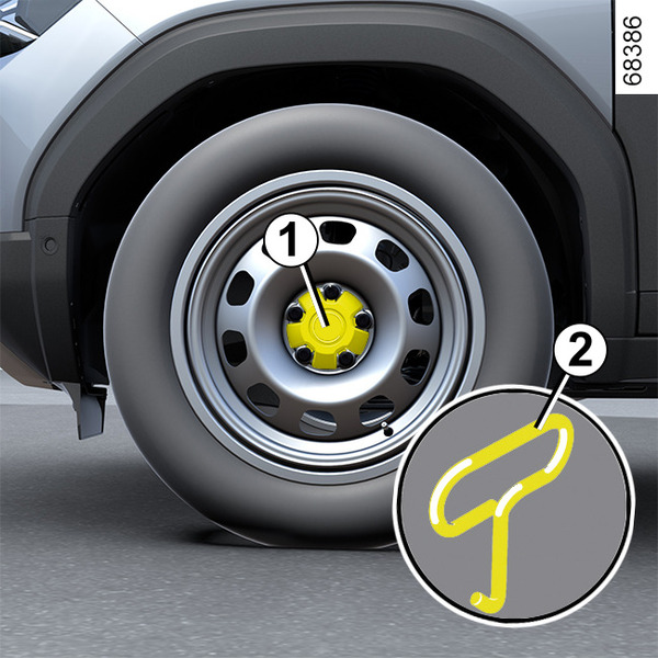 Zdejmij kołpak przy pomocy klucza do kołpaków 2, wsuwając narzędzie w pobliżu śruby koła Narzędzia.